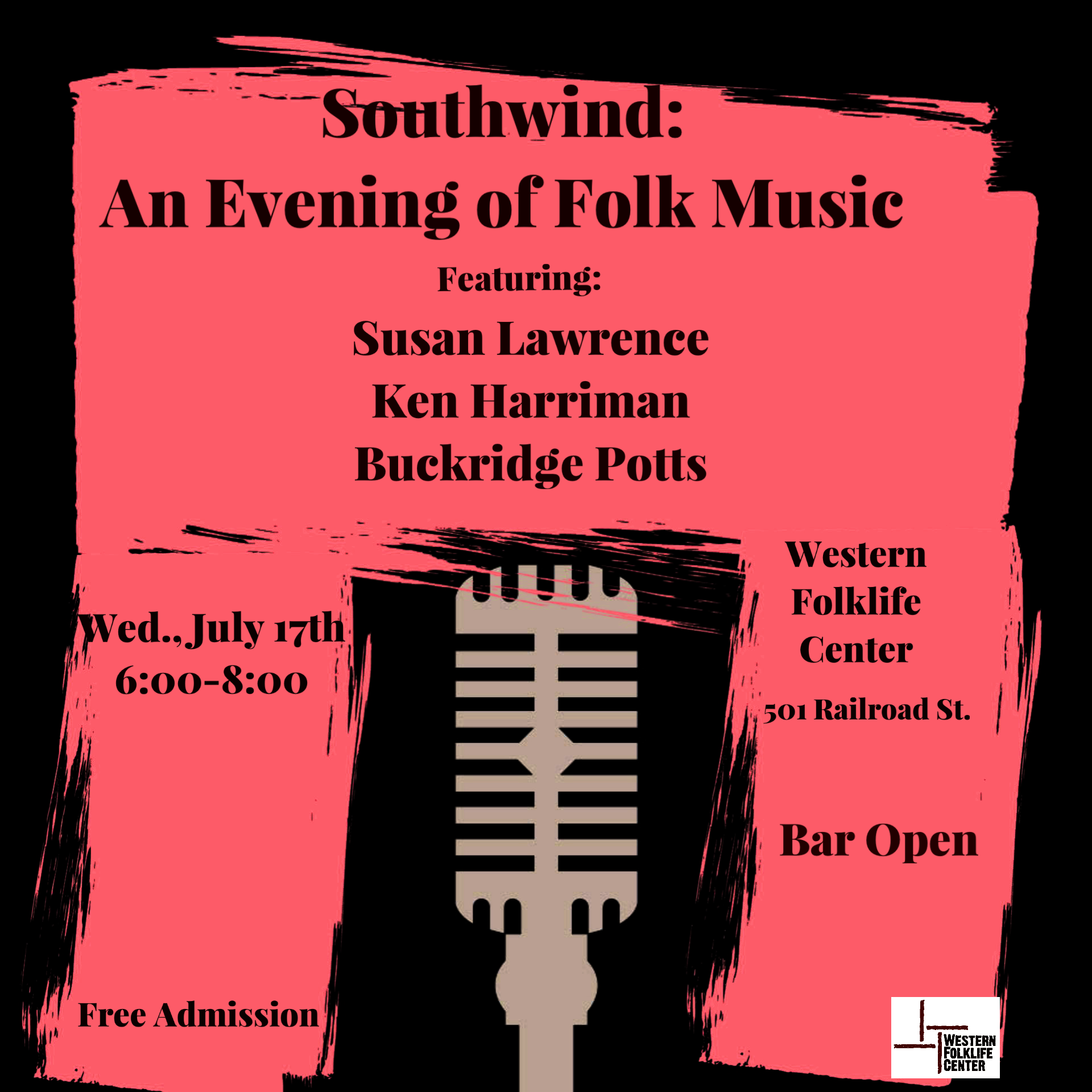 Popular local band Southwind continues its Third Wednesday concerts in the historic Pioneer Saloon from 6pm-8pm. Special guest: Buckridge Potts on vocals, guitar & banjo! Come listen (and there's room to dance!) to toe-tapping Celtic, Folk and Americana tunes while enjoying a refreshing beverage from the Bar. Follow Southwind—Carolyn Steninger, Susan Lawrence and Ken Harriman—on Facebook