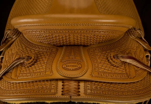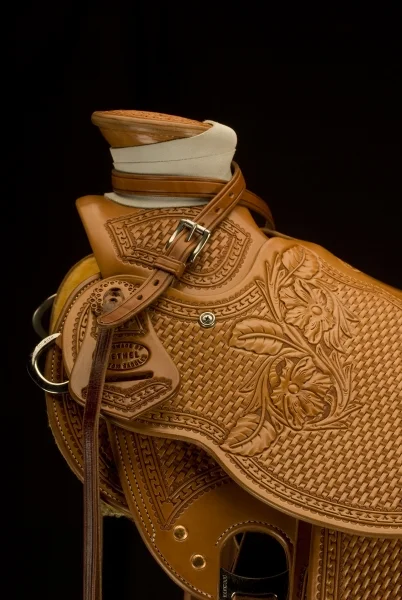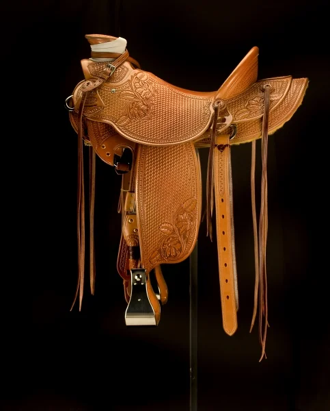 This saddle is built on a 15 1/2-inch traditional Wade tree made by Warren Wright, New Zealand. The saddle is full basket stamped with floral accents and trimmed in a Carlos design. The saddle has a 4-inch straight cantle, 7/8 flat plate rigging and 4-inch Wilson stainless steel bound Moran stirrups. All hardware is stainless steel.